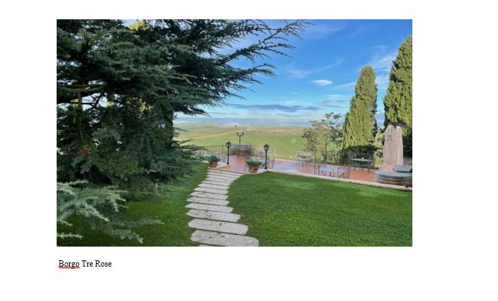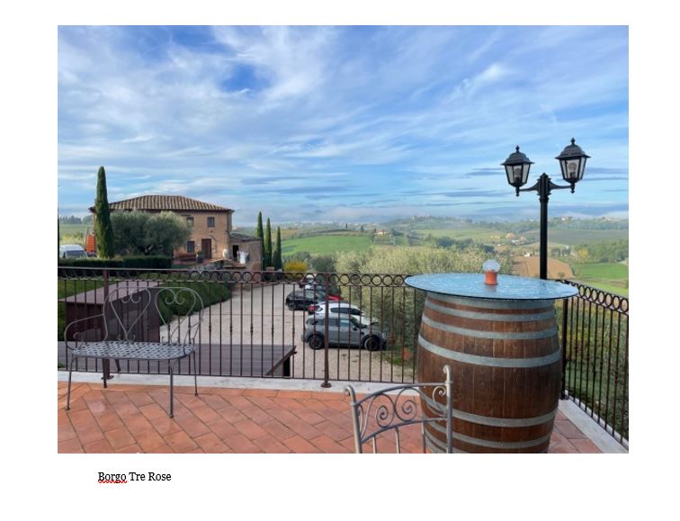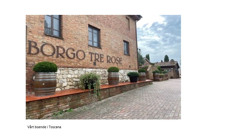Resan börjar med buss från hemorten till Landvetter, Göteborg. Härifrån flyger vi kl. 06:00 med mellanlandning i Amsterdam, vidare mot Florens i hjärtat av Toscana. Vi landar kl. 10:40 där E20 Busstouring/Stenstorps Buss väntar. Färden går vidare genom det vackra toskanska landskapet till Borgo Tre Rose. Efter incheckning finns tid att njuta av omgivningarna innan vi samlas för en gemensam middag på kvällen.